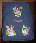 cotton twirl of denimsak word aan die voorkant versier met een van Cool Creations se pragtige ontwerp-borduurskeppings en 'n naam kan bygevoeg word as jy dit verkies.