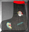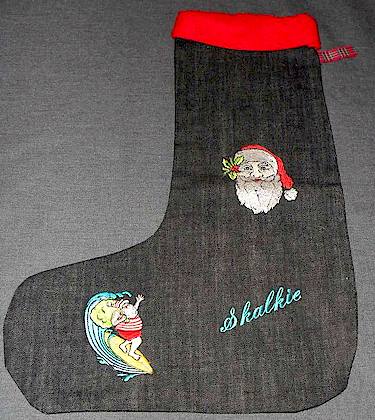 and embroidered with colorful Christmas pictures, such as a jolly old